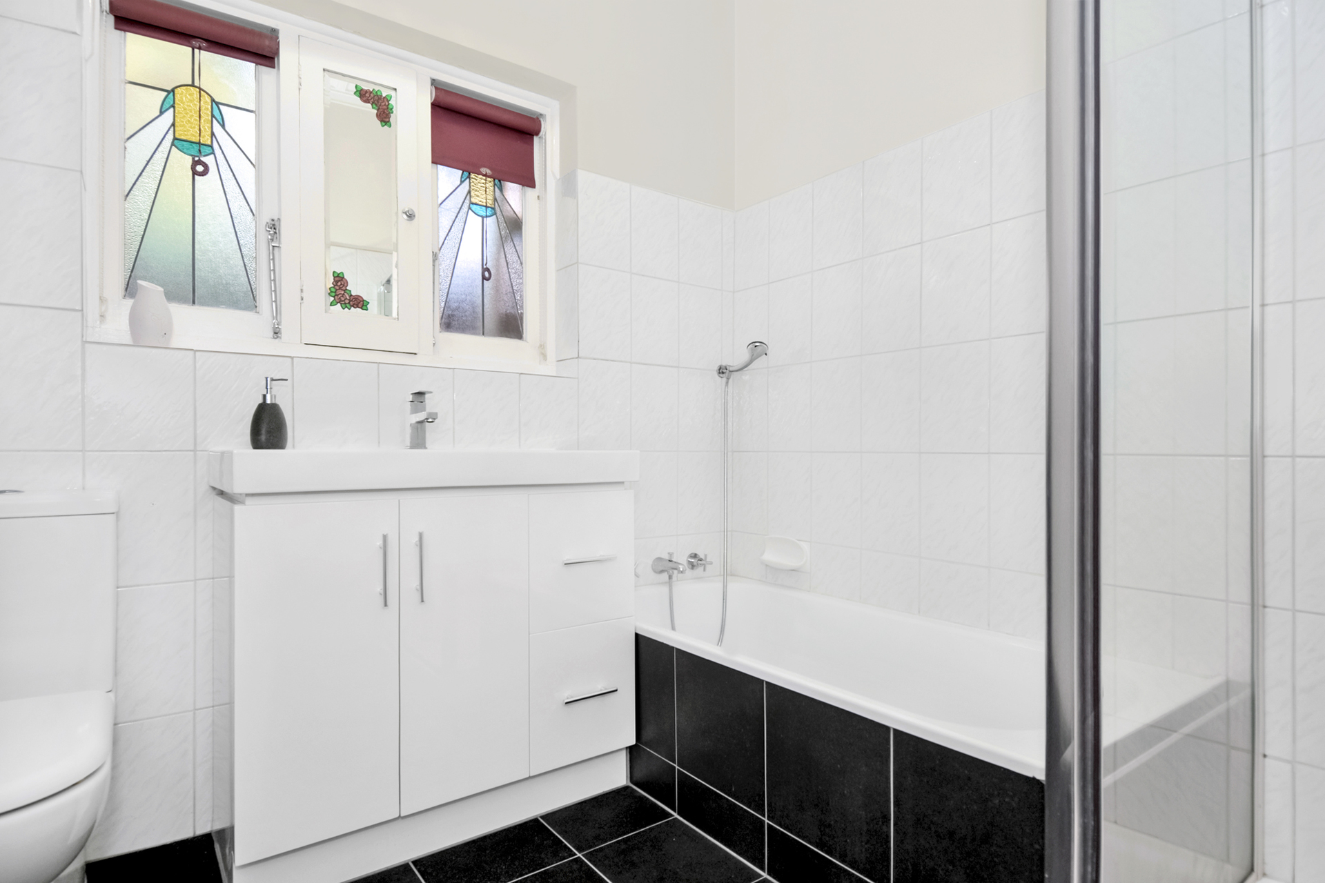 Renovated enormous gas equipped kitchen with dishwasher, fully tiled and lovely period stain glass windows, central tiled bathroom with separate shower and bathtub.