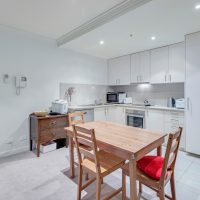 2 bedrooms, central bathroom, spacious open plan kitchen and living area leading to a large covered balcony.