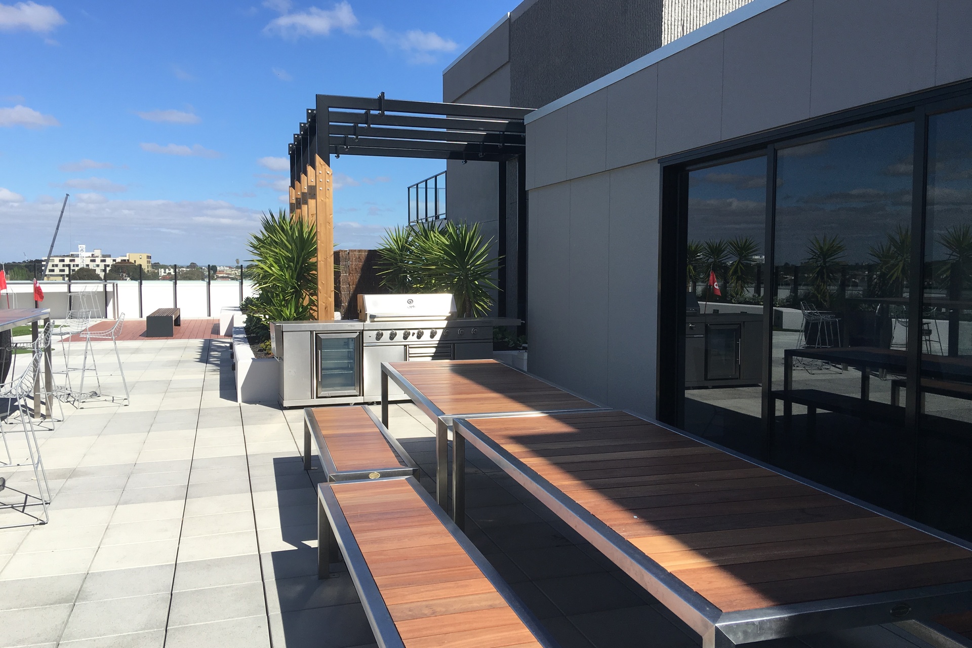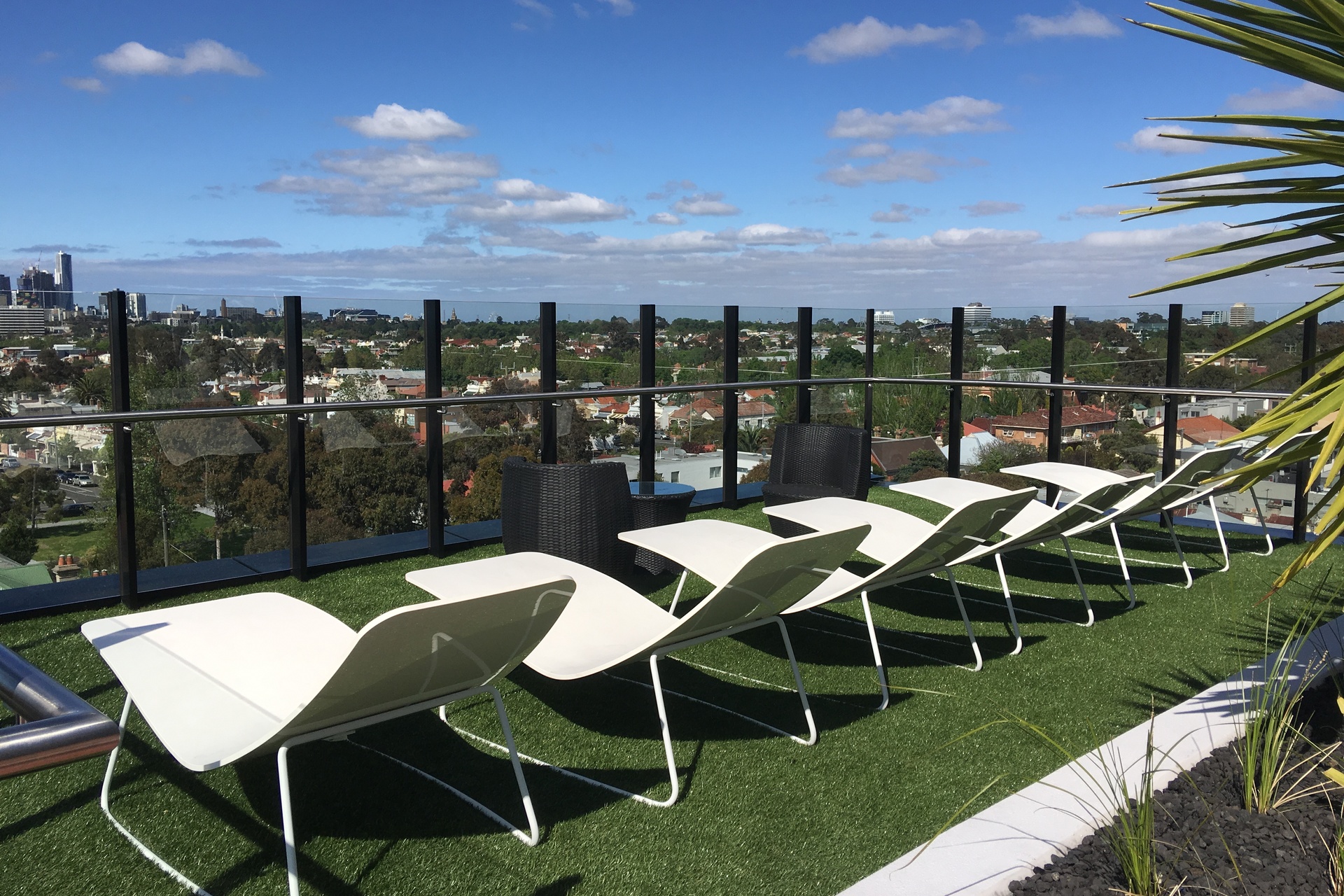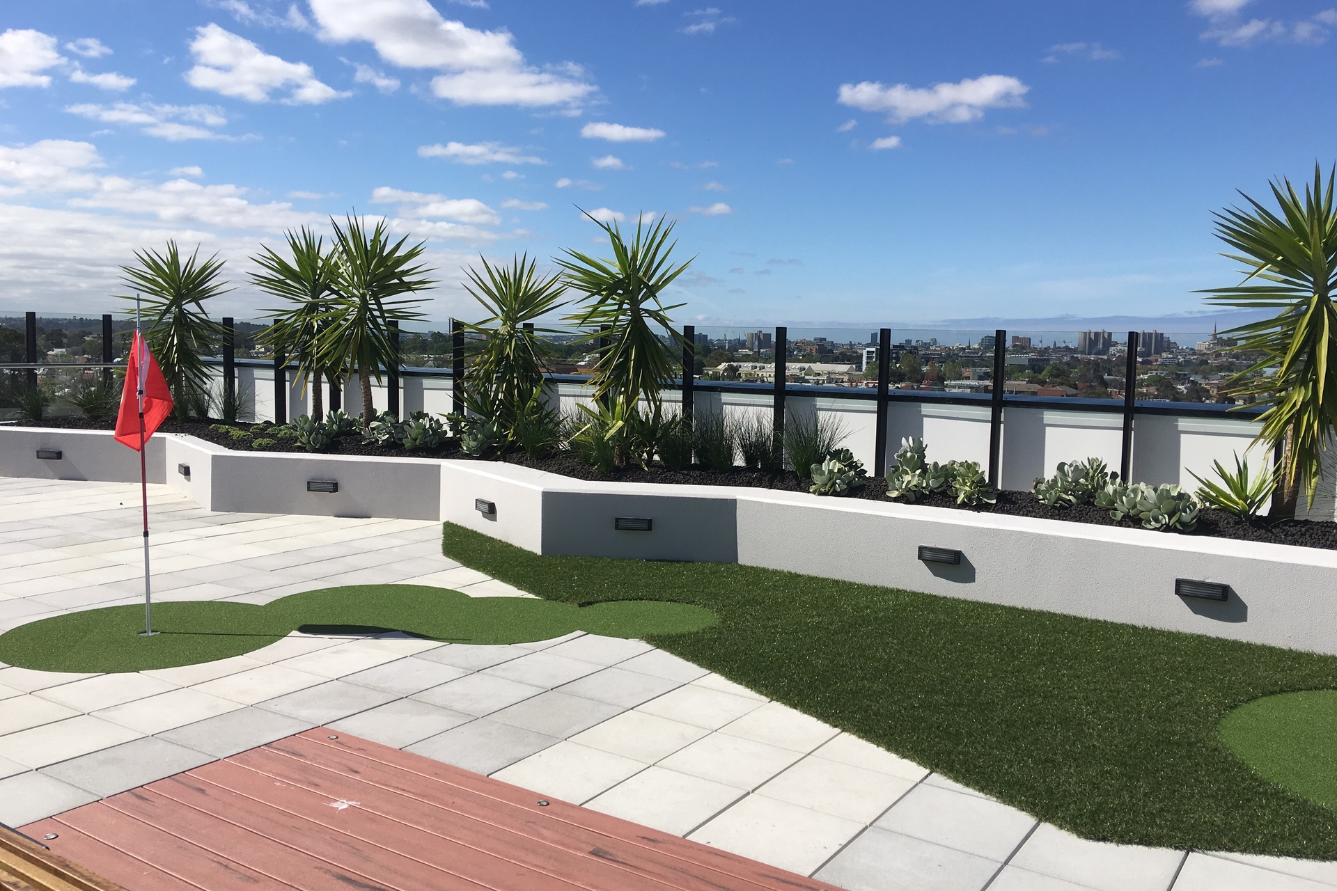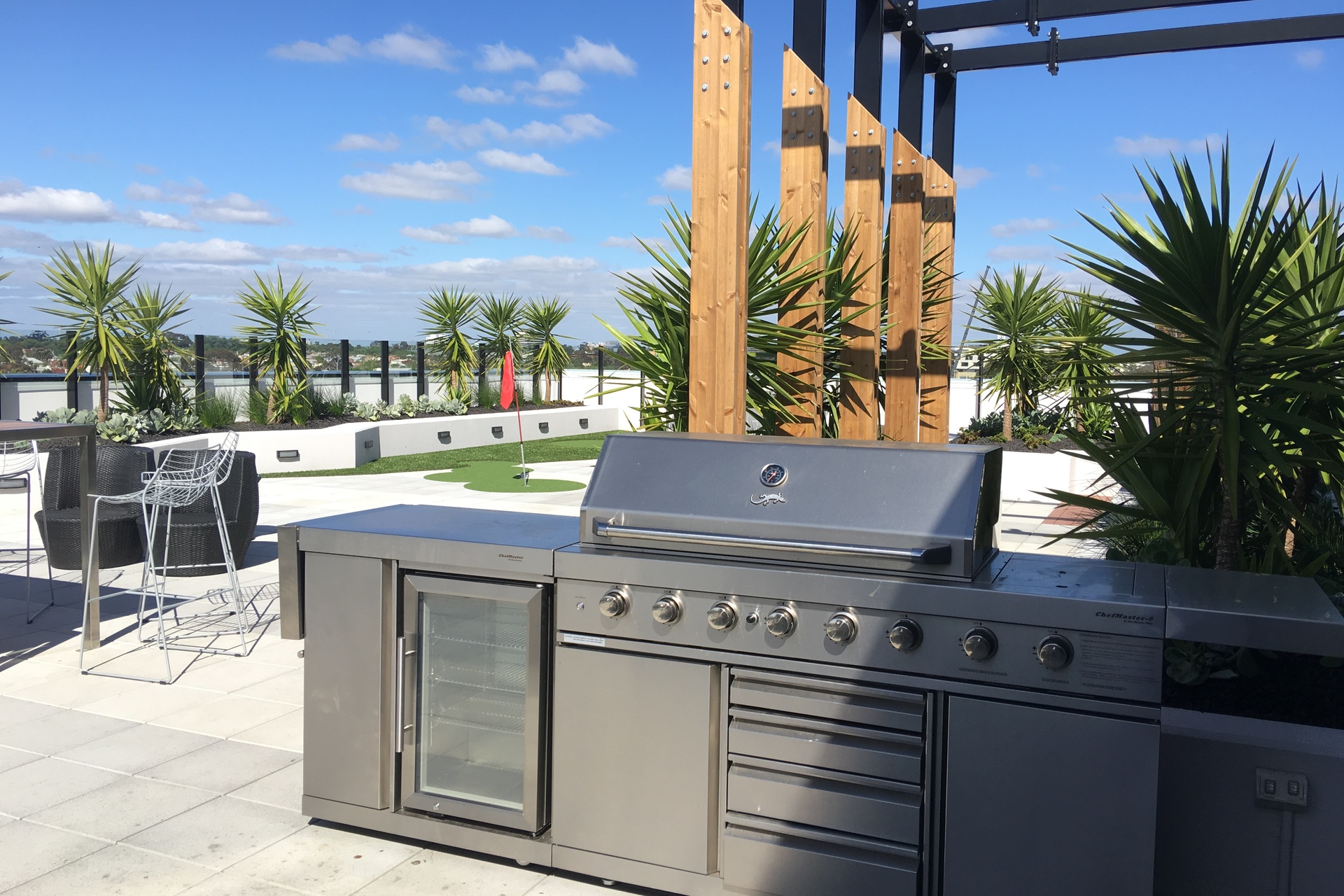Level 6 Roof top Retreat with expansive indoor dining room and outdoor alfresco zone. It offers sun lounges, outdoor spas to soak up the Melbourne panorama and a golf putting green.