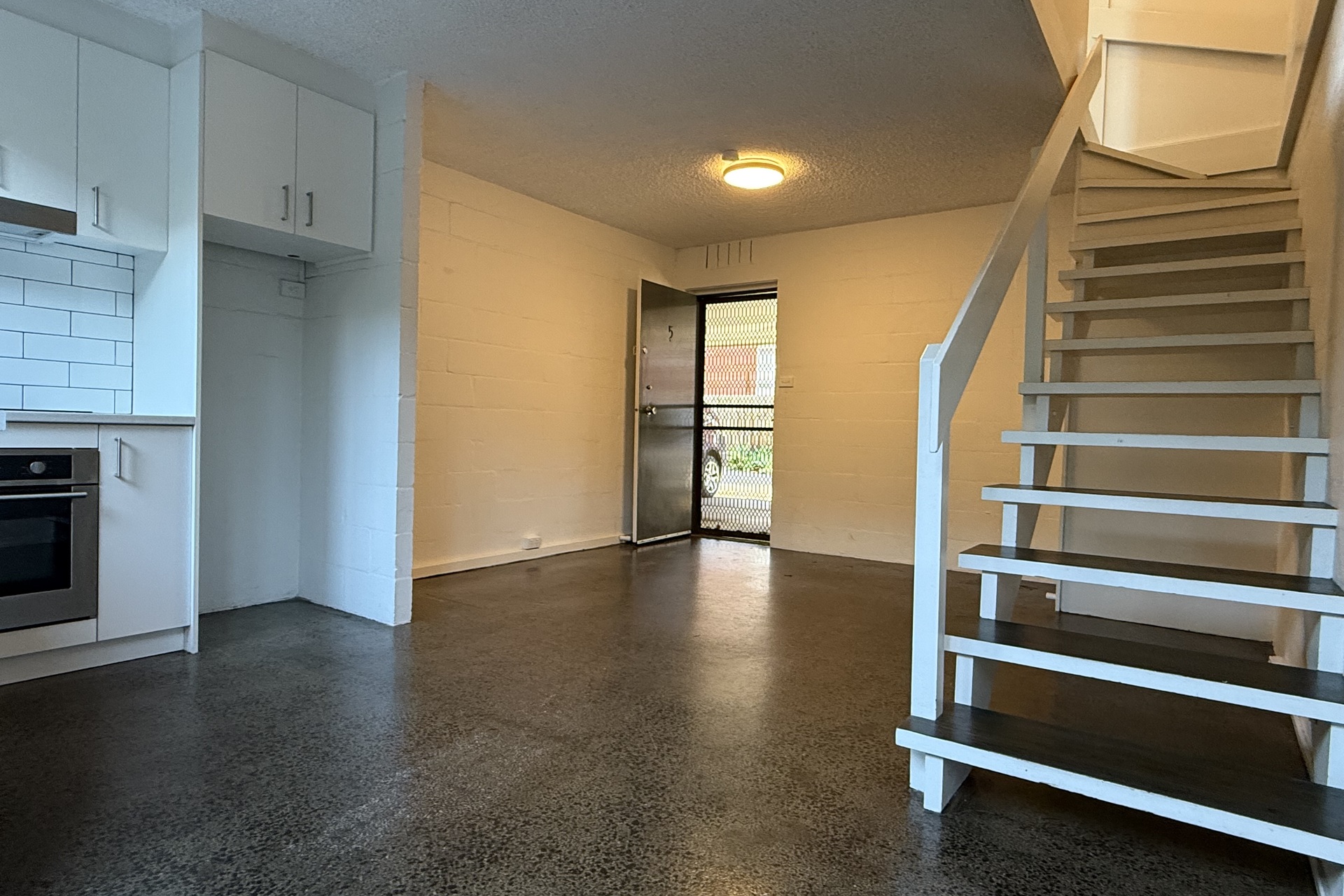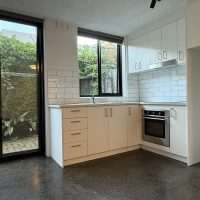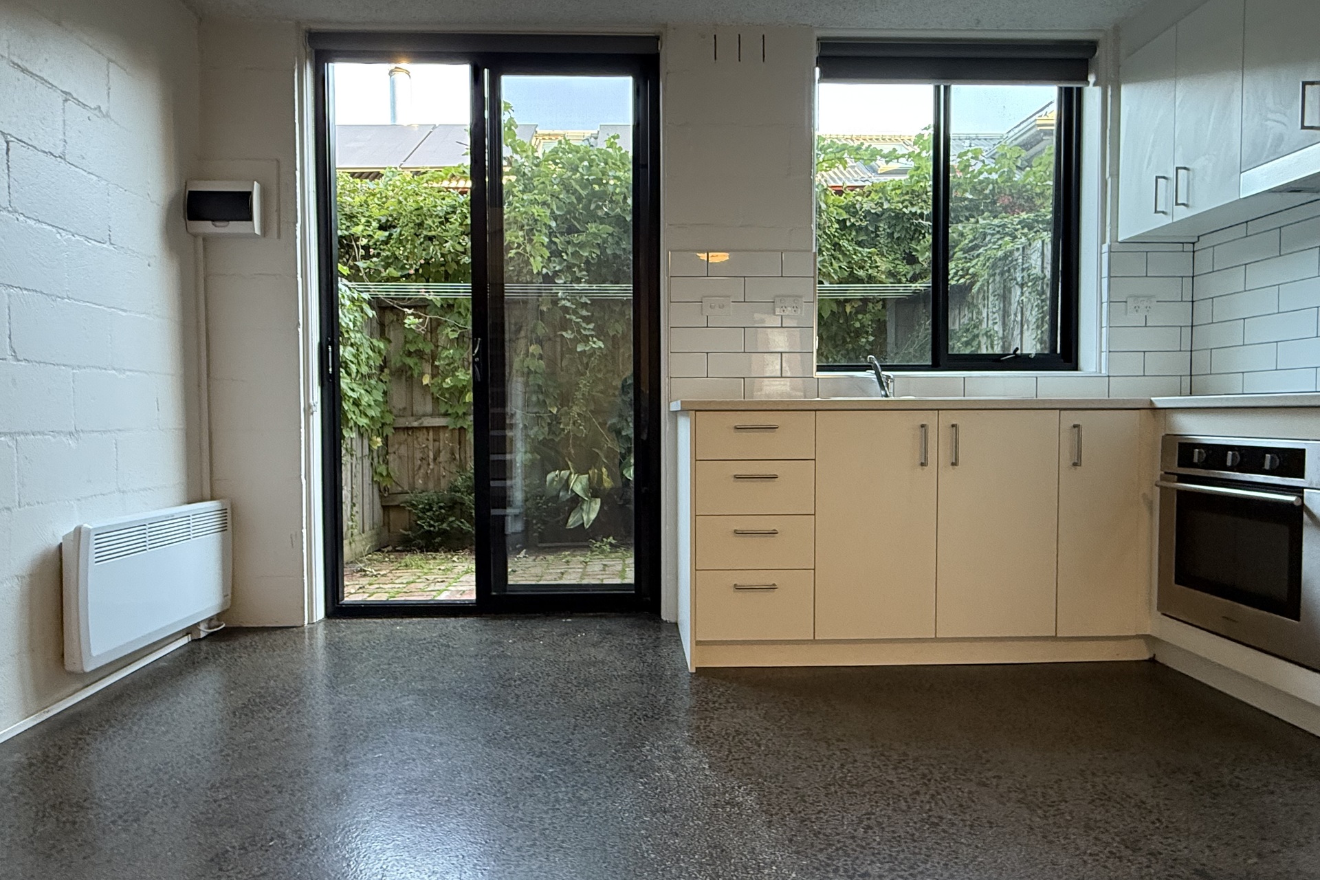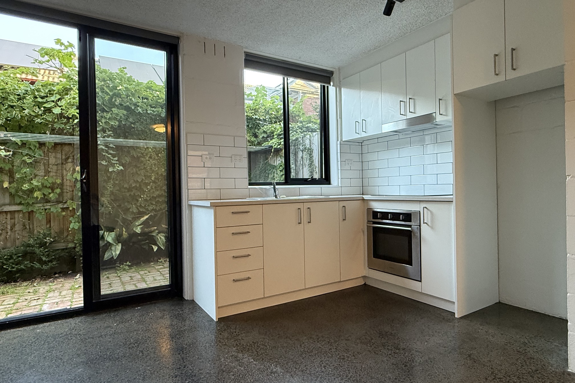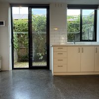Polished concrete floor, modern kitchen, courtyard at rear.