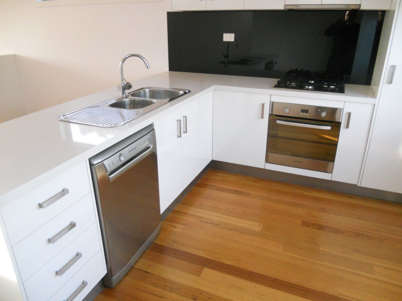 Upstairs, the modern kitchen is equipped with gas cooktops, an electric wall oven, and a dishwasher, complemented by a separate dining area and a front lounge room that opens onto a north-facing balcony. The home also features three split systems for heating and cooling, polished floorboards, and private outdoor areas at the rear.